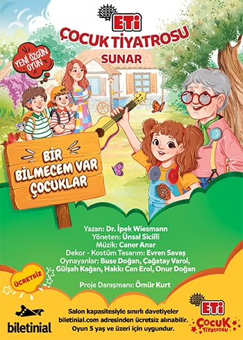 Türkiye’nin en uzun soluklu sosyal sorumluluk projelerinden biri olan Eti Çocuk Tiyatrosu, “Bir Bilmecem Var Çocuklar” ile hayvan ve doğa sevgisi, internetin potansiyeli, akran ve siber zorbalık, aile bağları, dostluk, barış, empati, kendine güvenme ve içindeki gücü keşfetme, birlikte hareket etmenin önemi, gibi konuları, eğlenceli ve eğitici bir şekilde çocuklara anlatıyor.